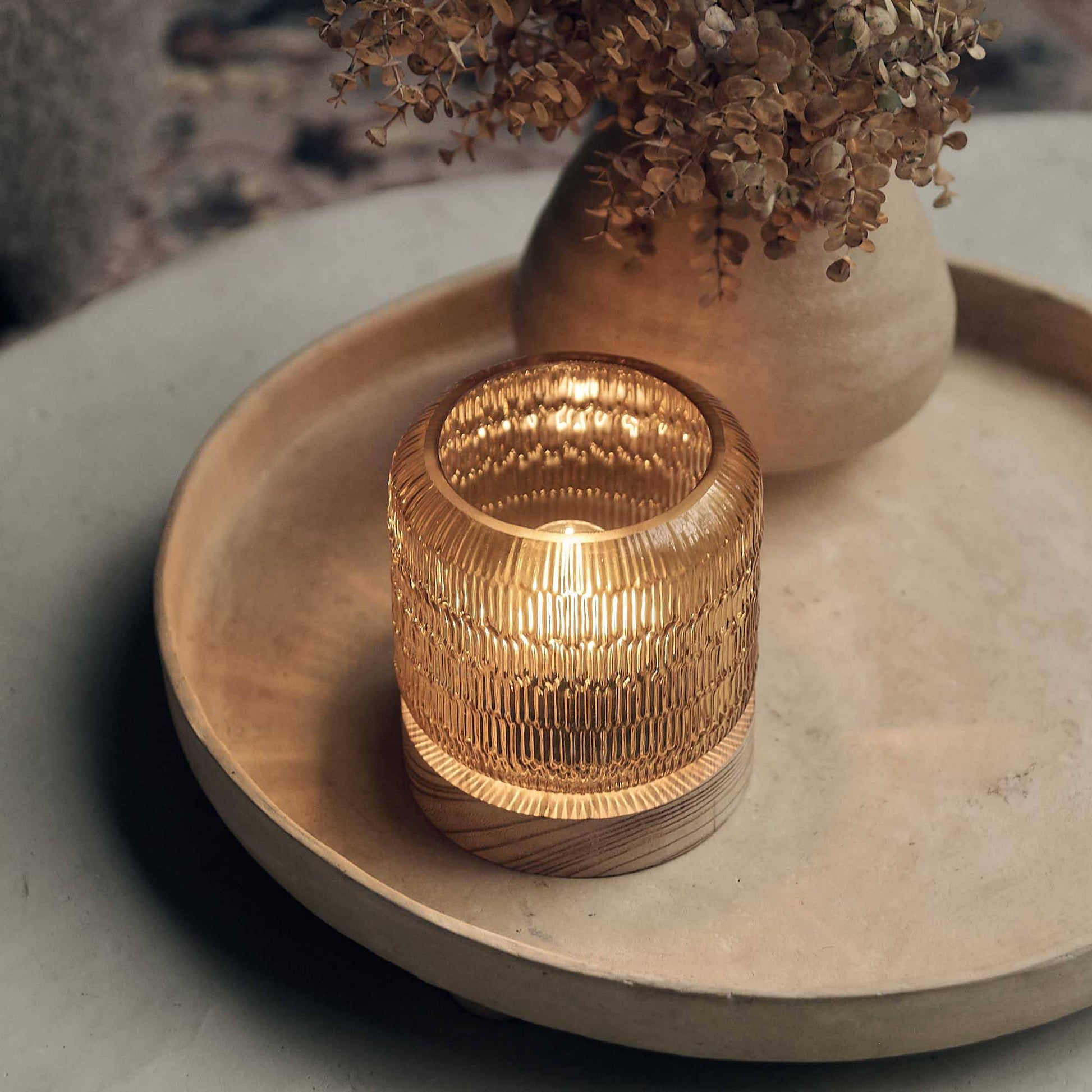 With its ridged glass design and wooden base, our Marielle Portable Table Lamp catches the eye while also creating the most inviting glow that you can take anywhere.