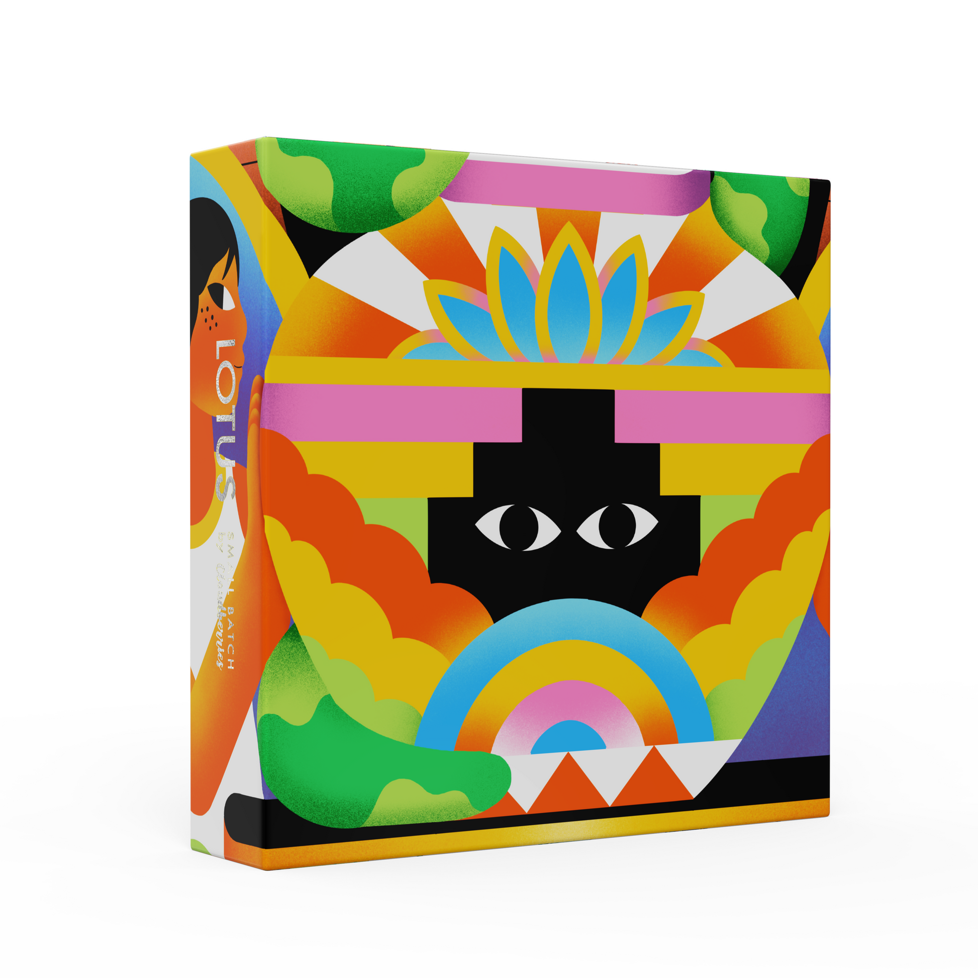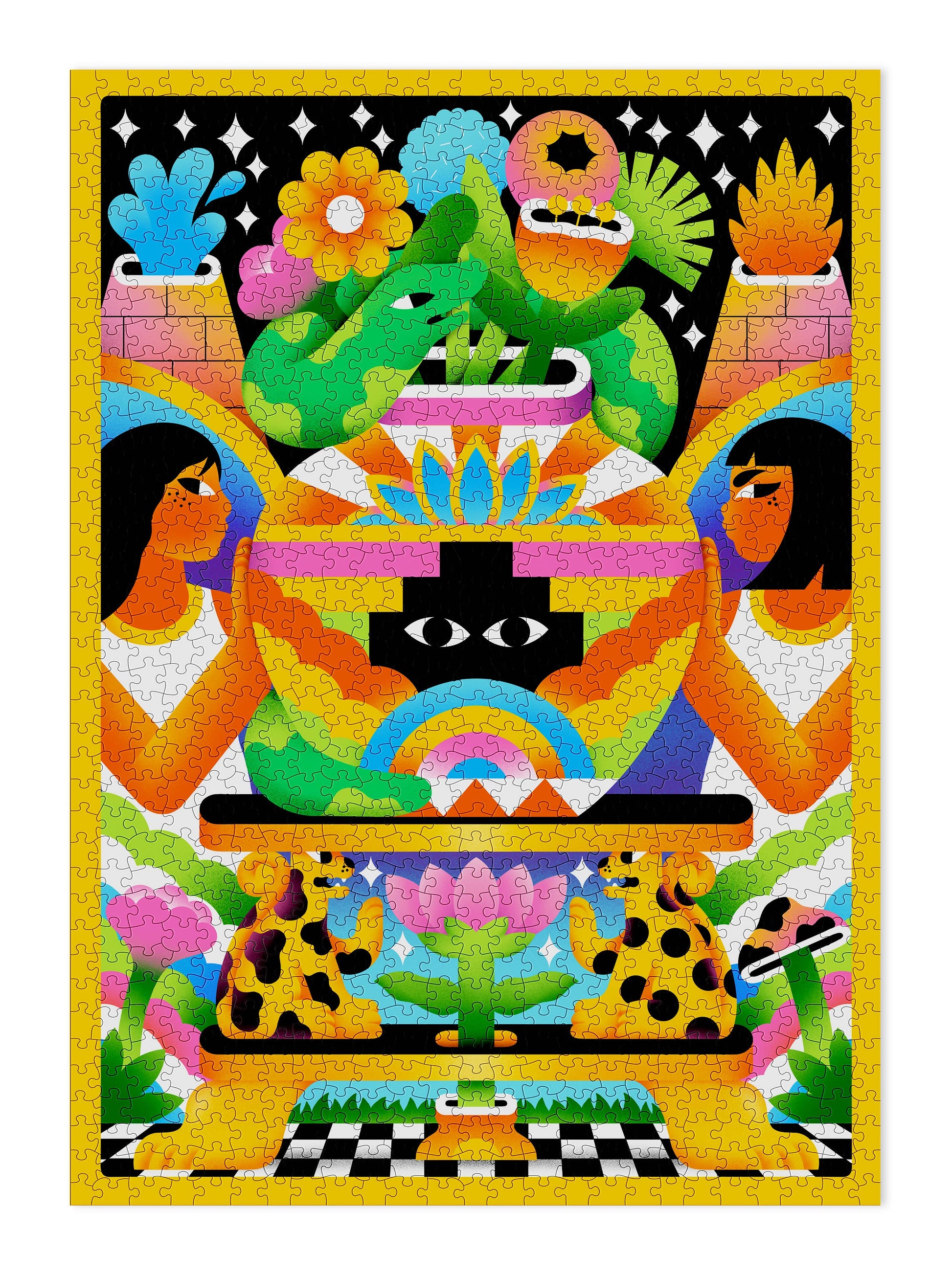 This bold modern puzzle is set in a kind of mystical garden of Eden, home to fiery volcanoes, psychedelic mushrooms and mysterious all-seeing eyes. At its centre is a rainbow coloured vase, carried by two enigmatic women and painted with the petals of the lotus – a symbol of purity, rebirth, and strength.