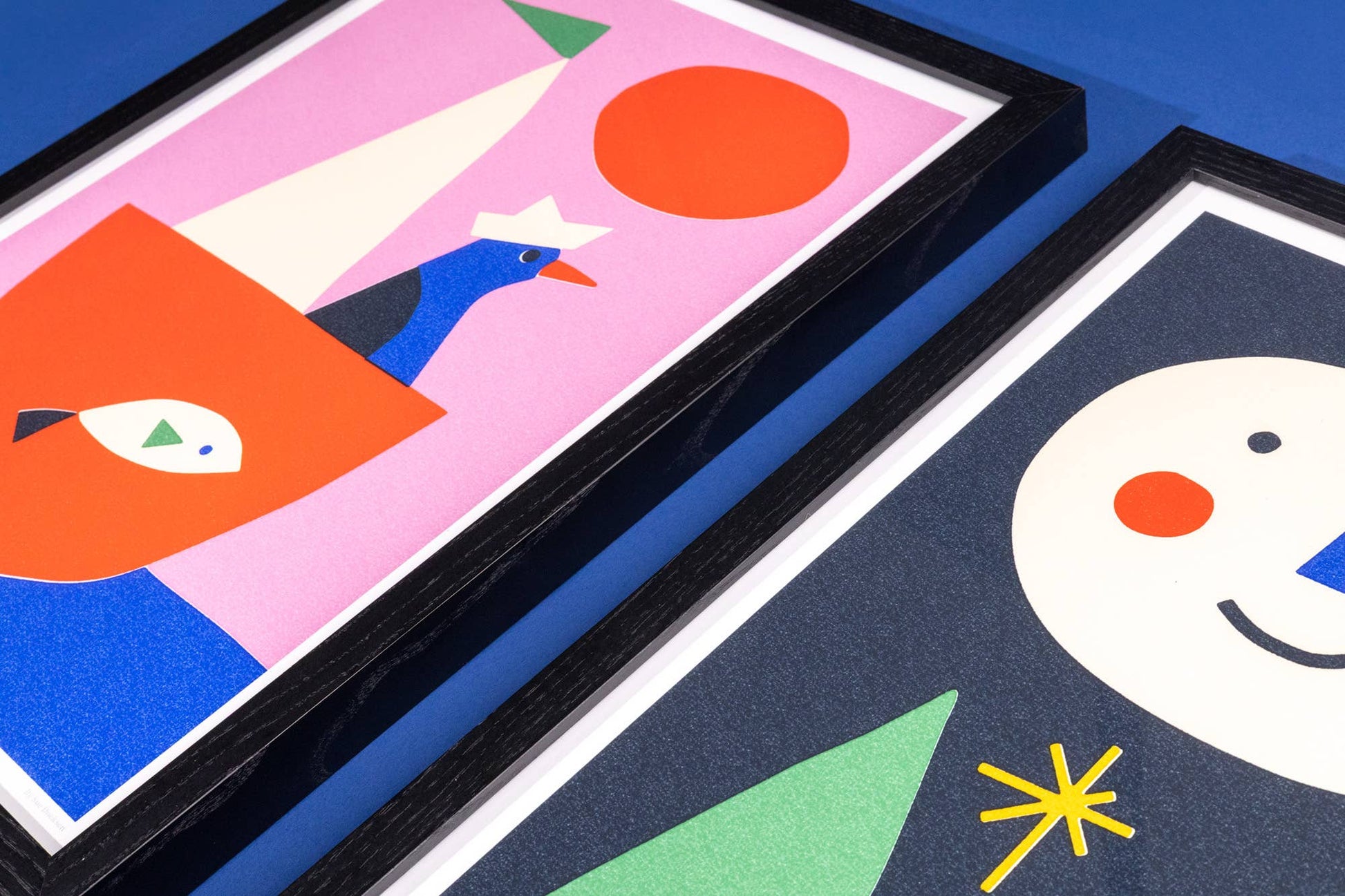 The textured, cut-paper style nods to vintage illustration and matchbox design, while the scene itself remains open to interpretation. A calming and colourful addition to family homes, studios or creative spaces.