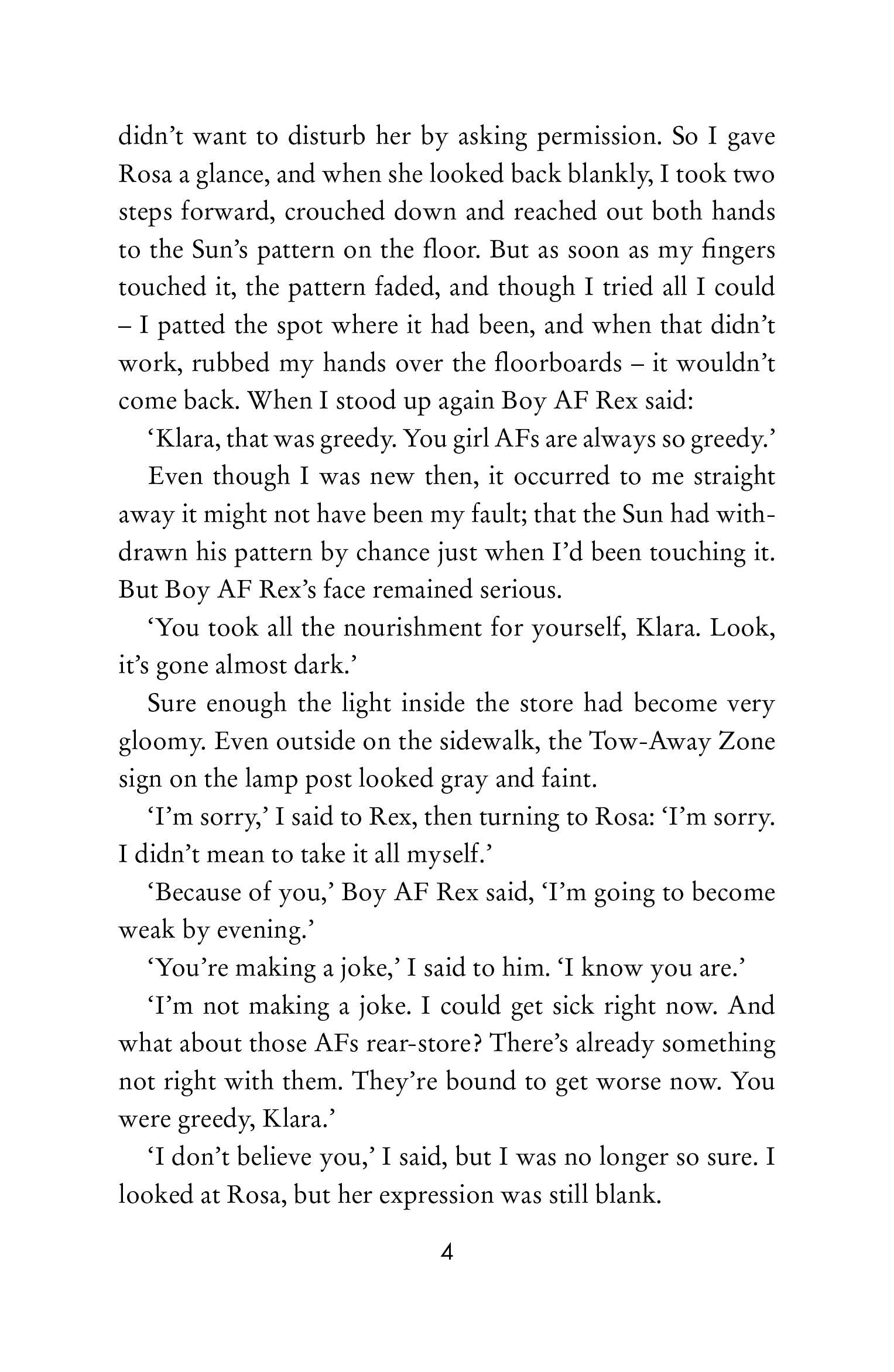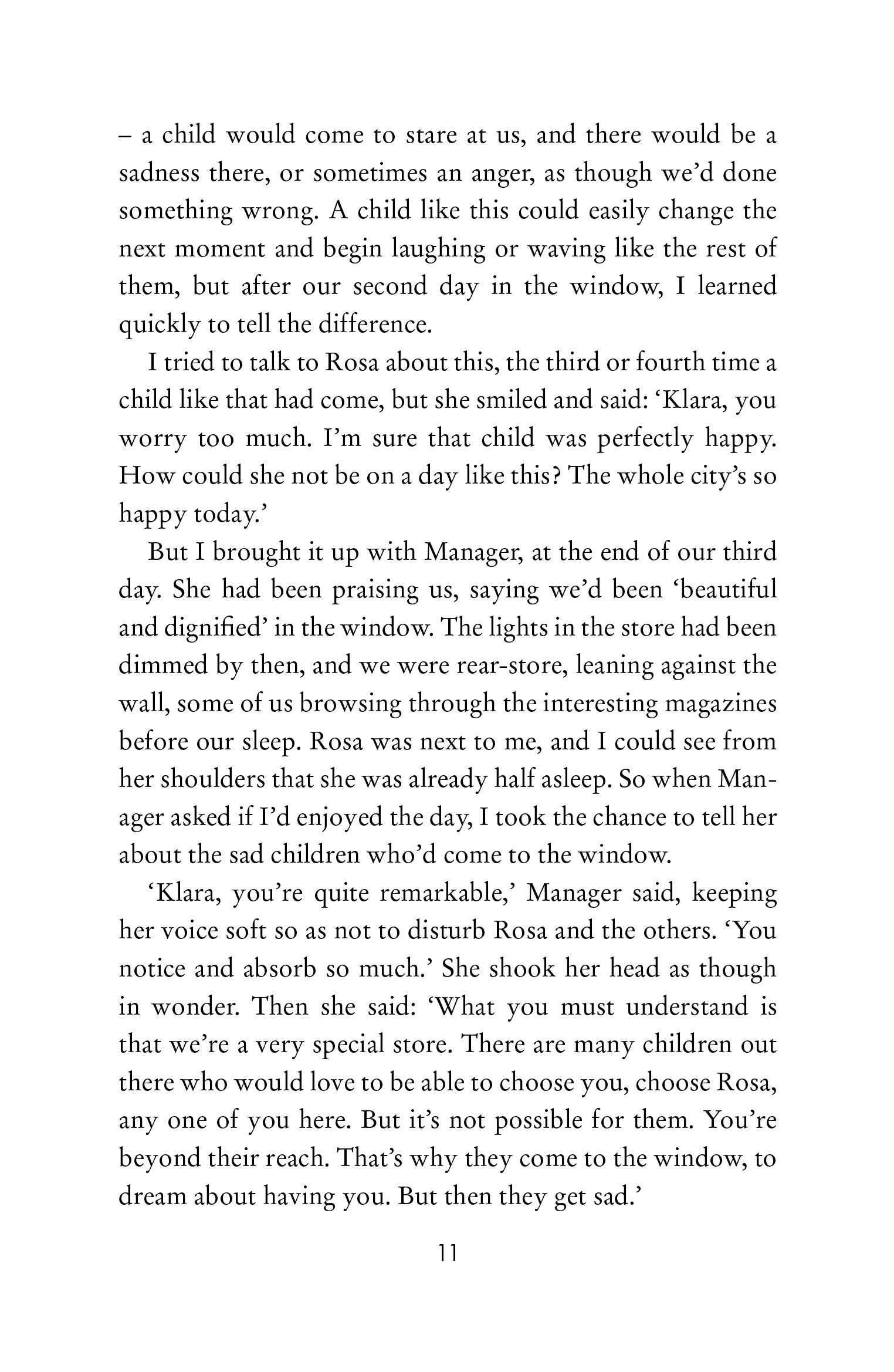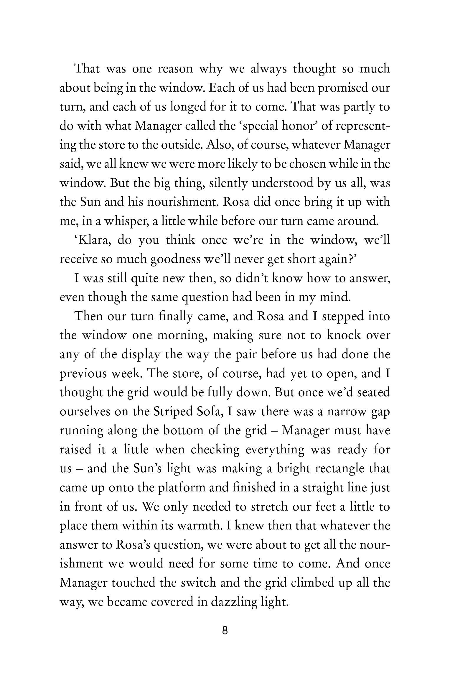 From her place in the store, Klara, an Artificial Friend with outstanding observational qualities, watches carefully the behaviour of those who come in to browse, and of those who pass in the street outside. She remains hopeful a customer will soon choose her, but when the possibility emerges that her circumstances may change for ever, Klara is warned not to invest too much in the promises of humans. In Klara and The Sun, Kazuo Ishiguro looks at our rapidly changing world through the eyes of an unforgettable narrator to explore a fundamental question: what does it mean to love?