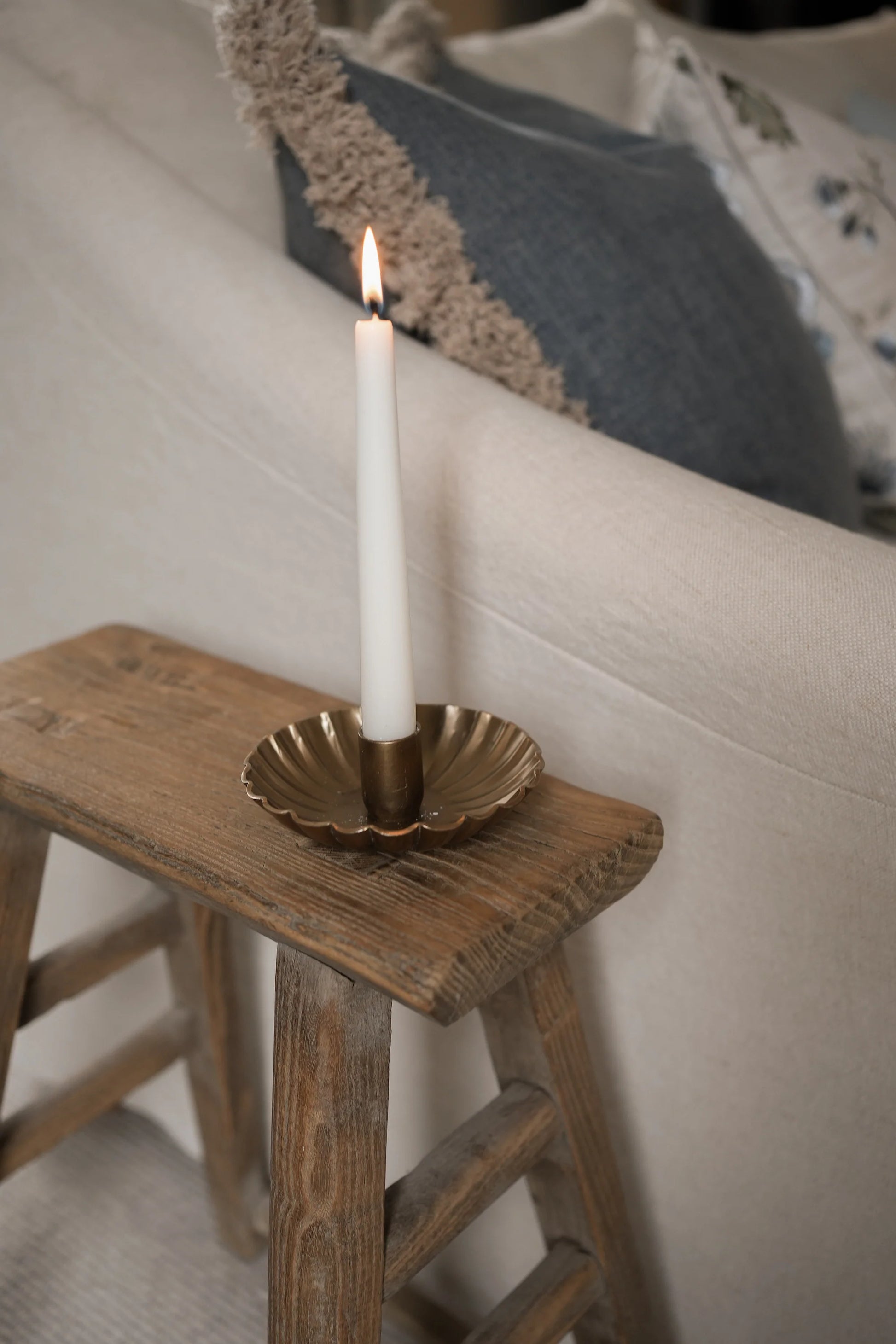 This lovely little scalloped candle holder fits standard dinner and taper candles. Hand finished artisan pieces.