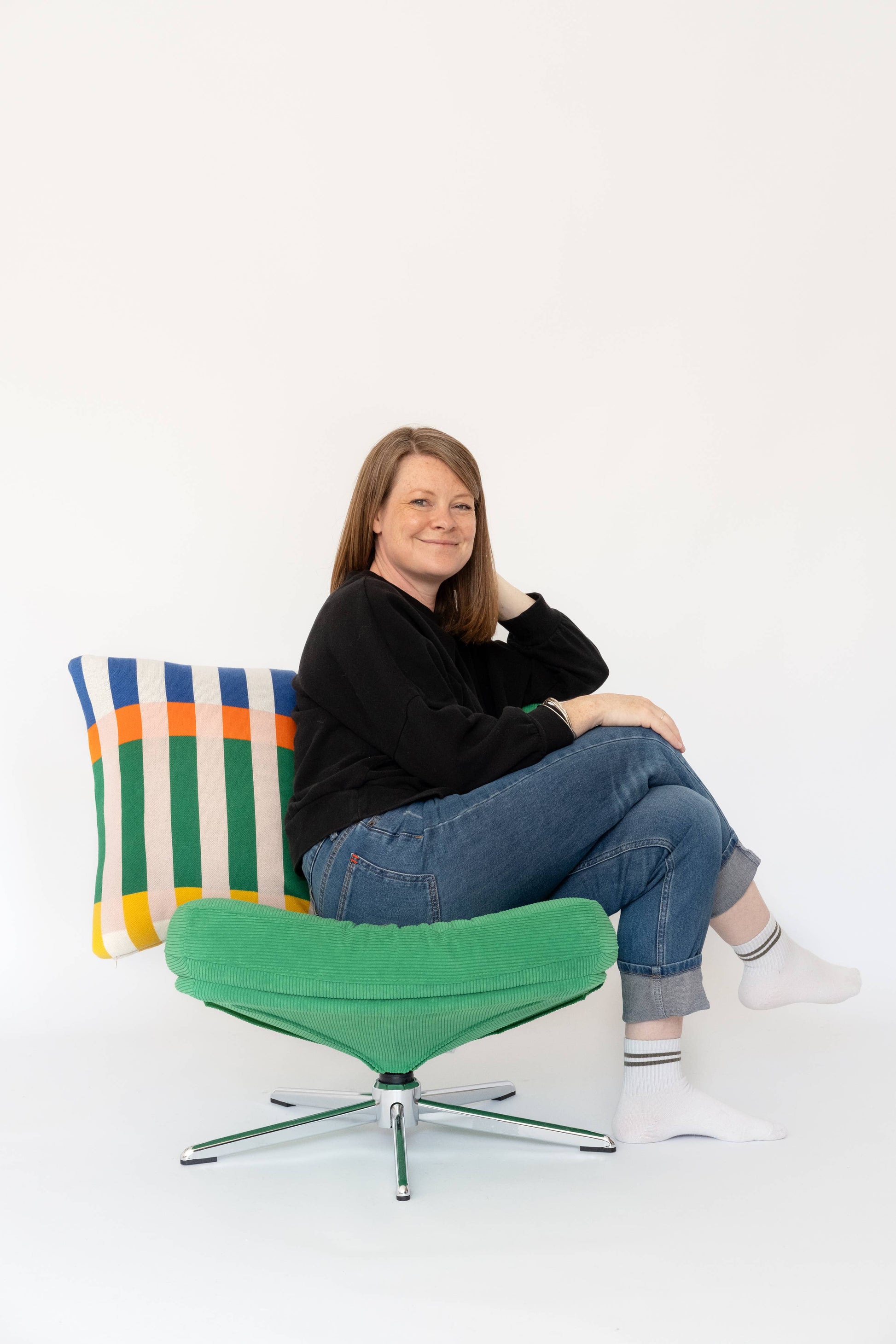 Add a fab colour pop to your space with our super-bright geometric Studie cushion. This 100% cotton knit cushion, featuring bold, graphic stripes in cobalt blue, green, pink, orange, and yellow makes a real statement with its dynamic colour-blocking design.