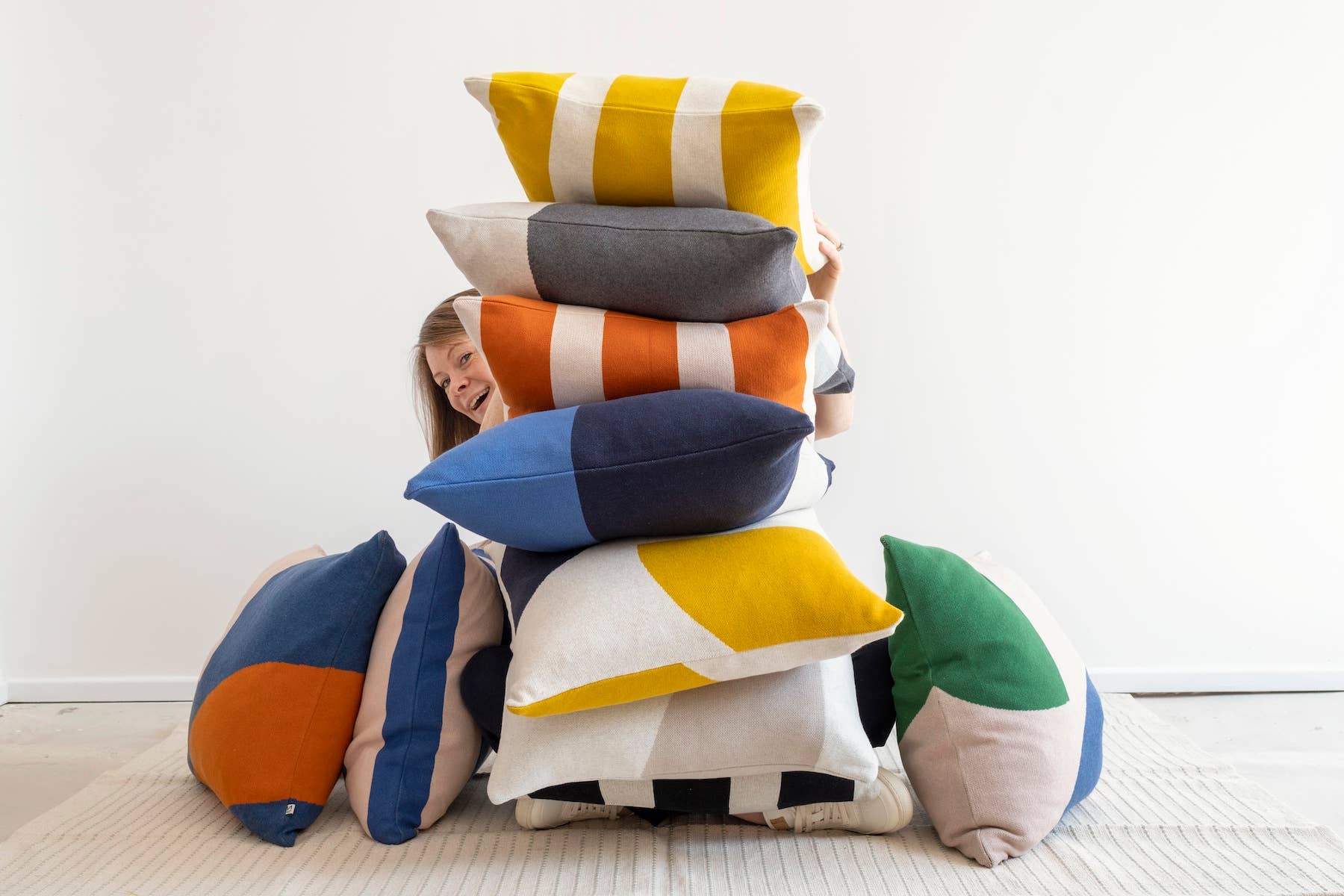A reversible cotton knit cushion featuring bold cobalt and green shapes, on a blush pink base. We like to see this cushion alongside other range favourites Ilo Blue and Ilo Navy.