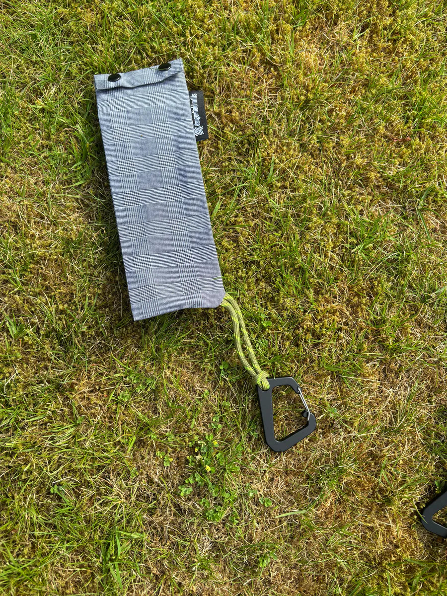 Titanium spork with waxed cotton pouch, paracord and aluminium caribiner to attach to other bags and accessories.